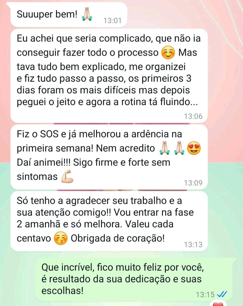 Dentro do e-book você vai encontrar um capítulo de S.O.S para alívio imediato, com recomendações simples e fáceis de aplicar que já podem te proporcionar um alívio dos sintomas mais intensos da crise. Iniciando o protocolo, nos primeiros dias já é possível sentir um alívio dos sintomas, vai depender da quantidade de fungos que há no seu corpo, do quão está sobrecarregado o seu sistema imunológico, por exemplo, então é muito individual para cada pessoa.